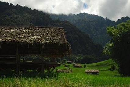 Zuckerrohr und Bambus bekannt. Hütten,